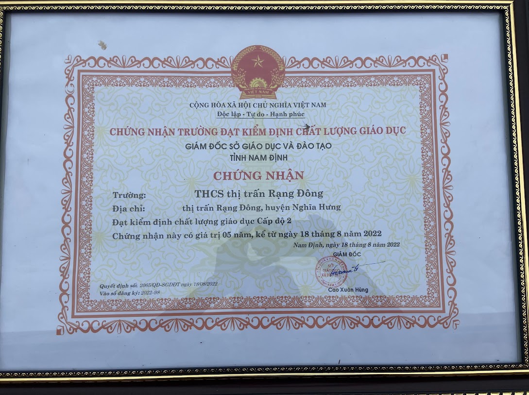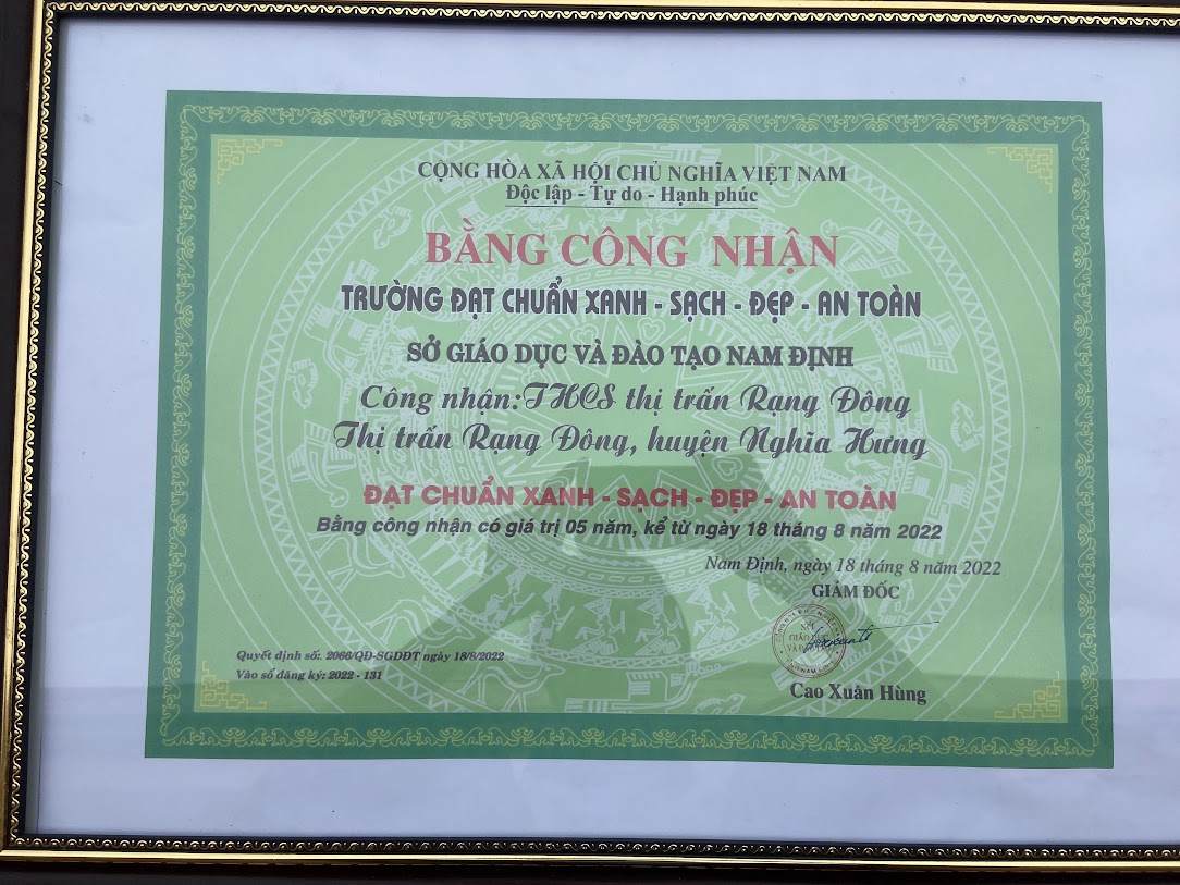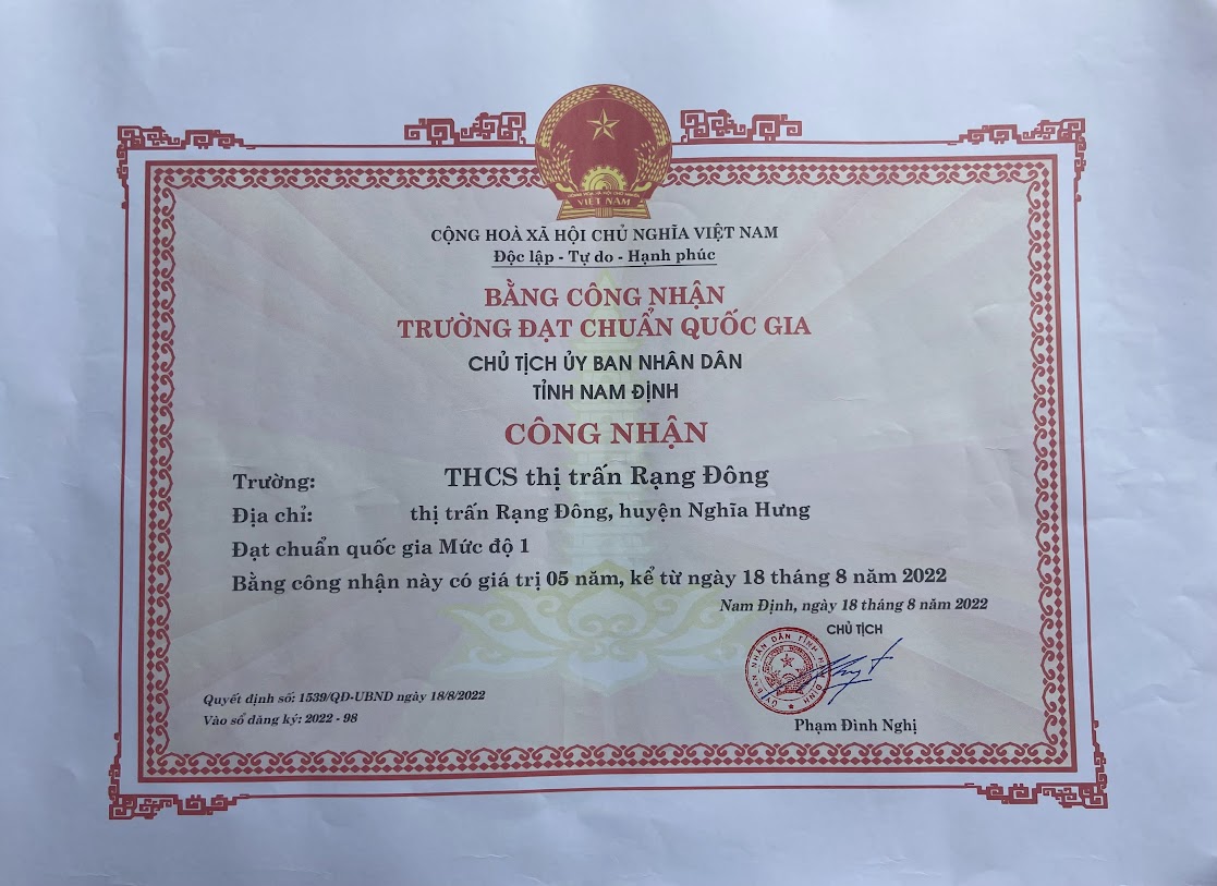Ngày 18/8/2022, chủ tịch UBND tỉnh Nam Định và Sở GD – ĐT đã ra các quyết định công nhận trường THCS TT Rạng Đông đã đạt 4 chuẩn: Trường đạt chuẩn Quốc gia mức độ 1, chuẩn xanh – sạch – đẹp – an toàn, chuẩn kiểm định chất lượng cấp độ 2 và chuẩn thư viện tiến tiến: